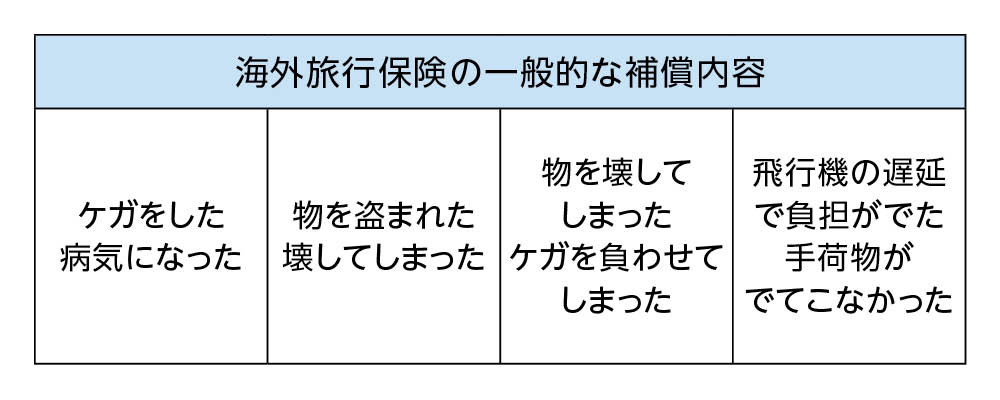 - 海外旅行をする際には、保険の補償内容をよく確認し契約するようにしましょう